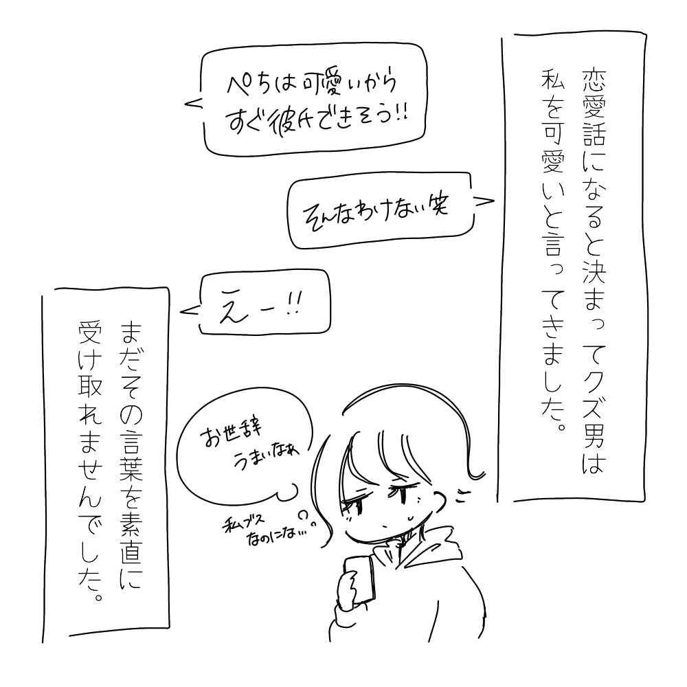 クズとメンヘラ 32020.06.30クズとメンヘラ こちらのお話は3話になります。クズとメンヘラ 2↑前回のお話はこちらから。クズとメンヘラ 1↑最初から読みたい方はこちらから。 本編 広告 広告 あとがき恋愛話ってなんかもう典型ですよね。ブスって言われることに慣れすぎて、かわいいって言ってくれるクズ男の存在は新鮮でした。悪い気はしていなかったけど、いい人だなとしか思っていませんでした。続きます。 0 同じカテゴリの記事 クズとメンヘラ 29 クズとメンヘラ 28 クズとメンヘラ 27 クズとメンヘラ 26 クズとメンヘラ 25 クズとメンヘラ 24 クズとメンヘラ 23 クズとメンヘラ 22 クズとメンヘラ 21 クズとメンヘラ 20 クズとメンヘラ 19 クズとメンヘラ 18 クズとメンヘラ 17 クズとメンヘラ 16 クズとメンヘラ 15 クズとメンヘラ 14 クズとメンヘラ 13 クズとメンヘラ 12 クズとメンヘラ 11 クズとメンヘラ 10 クズとメンヘラ 9 クズとメンヘラ 8 クズとメンヘラ 7 クズとメンヘラ 6 クズとメンヘラ 5 クズとメンヘラ 4 クズとメンヘラ 3 クズとメンヘラ 2 クズとメンヘラ 1 前の記事 クズとメンヘラ 2 2020.06.30次の記事 クズとメンヘラ 4 2020.06.30アプリなら通知ですぐ読める! NAPBIZブログ