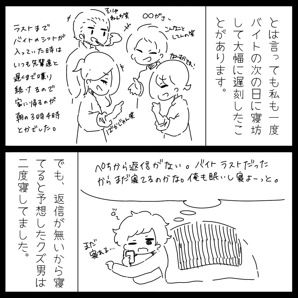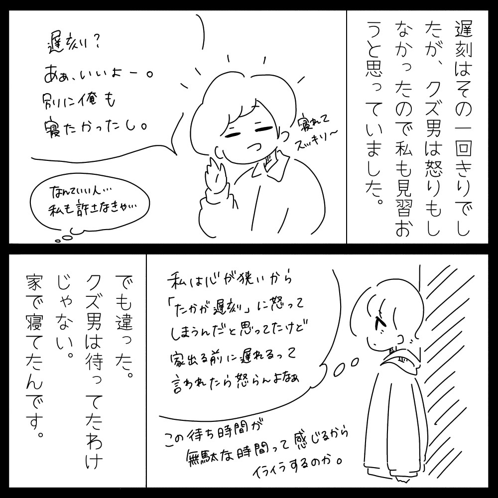 私も遅刻した前科があるので強く言えませんでしたが、そもそも家で寝てた人と外で待ってた人では感じ方が違うのは当たり前です。