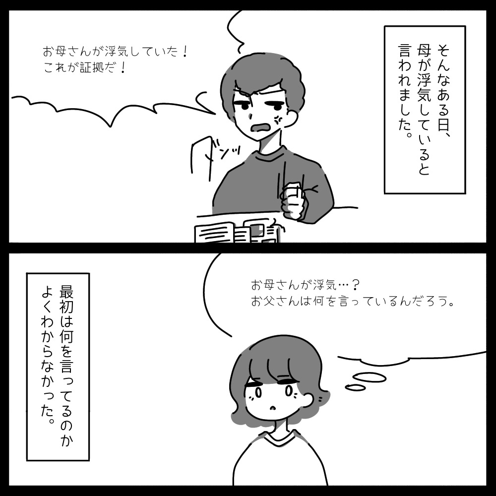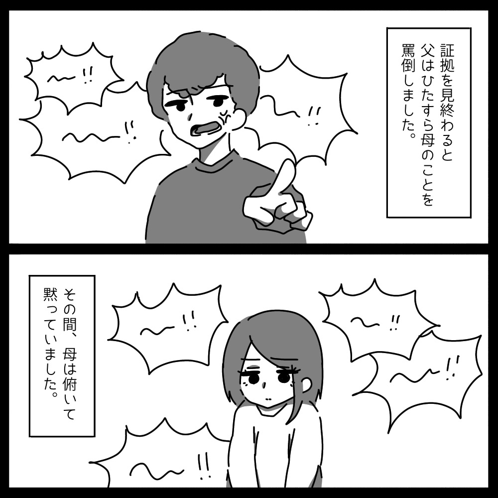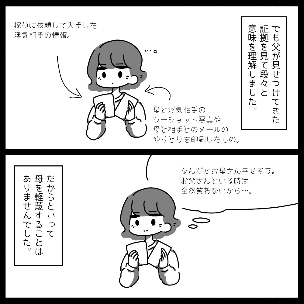 父から証拠を見せられたのはショックでしたが、それよりも母が笑顔で楽しそうだったので、母に対しての嫌悪感は有りませんでした。私の場合はですが。