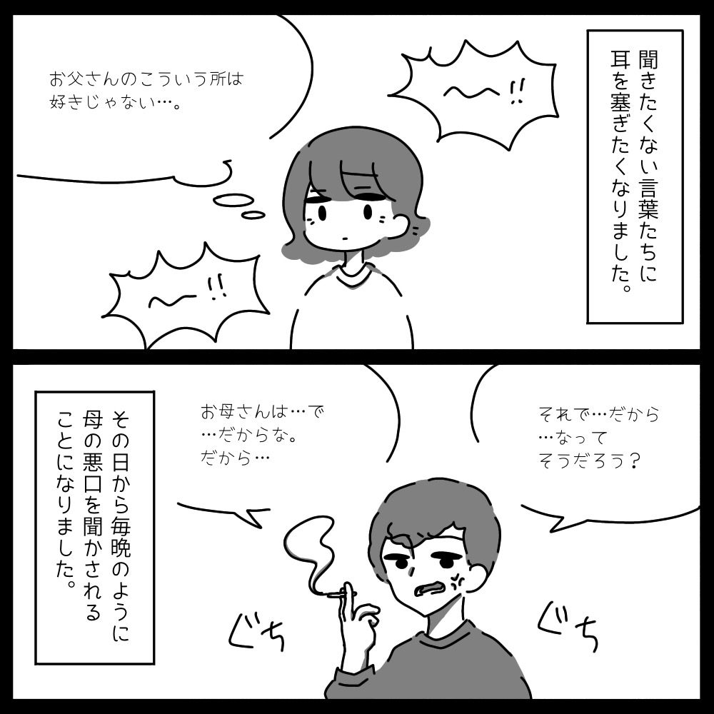 それよりも夜中まで聞きたくない母の悪口を聞かされるのが苦痛でした。
